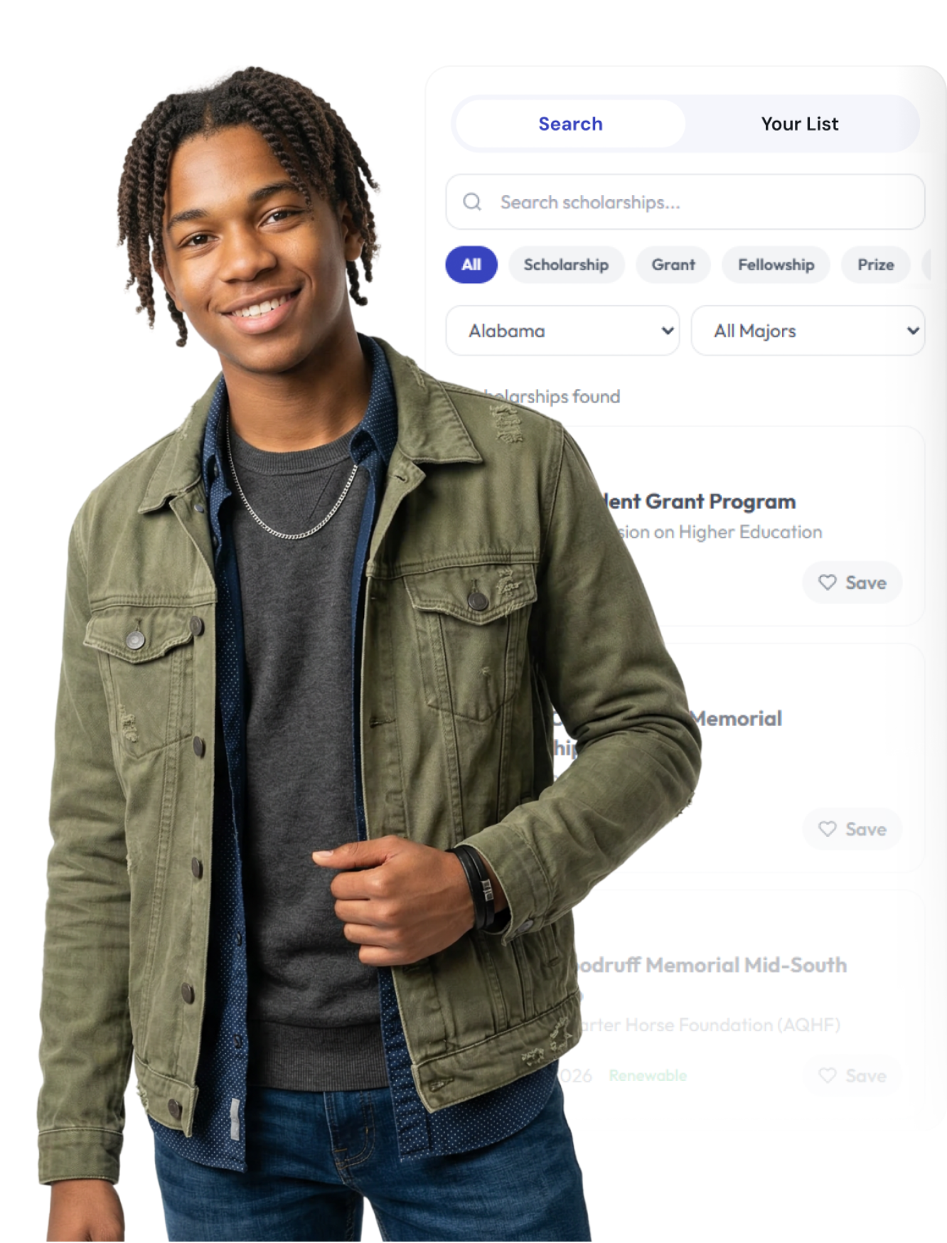 Browse thousands of scholarships with intuitive filters for location, major, category, and list-based matching.